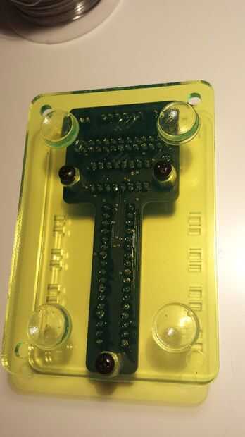 Alinee los agujeros de 3 de la junta con los espaciadores de Hex. Coloque a los 3 espaciadores restantes encima de estos agujeros. Coloque con cuidado la parte superior para que los orificios estén alineados aún. Inserte los 3 los tornillos restantes y gire hasta que este apretado. Coloque los pies de 4 caucho, uno en cada esquina.