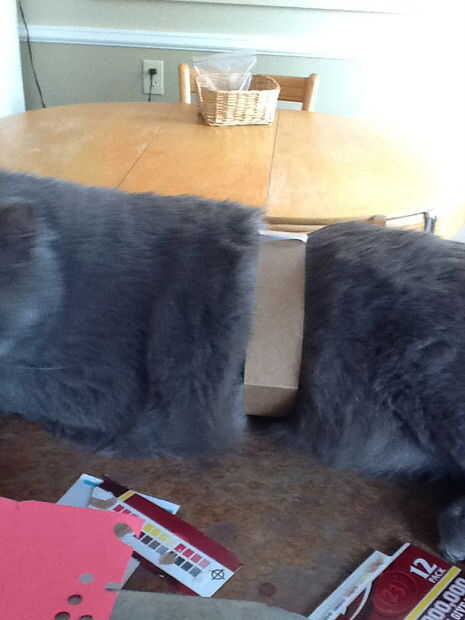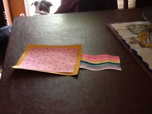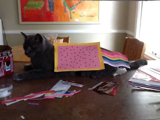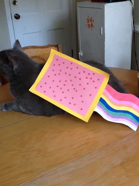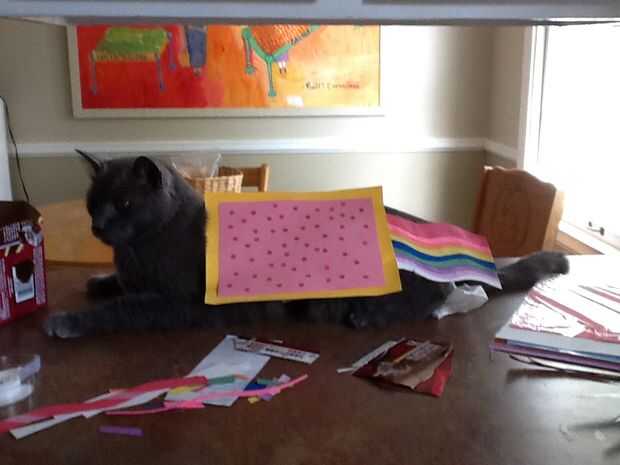 Este es mi gatito Artemis este traje de Nyan Cat (un meme de internet para ésos desconocedores)! La idea vino de solo querer tenerla a parecerse a un gato famoso de internet, y así sucedió es gris como el Nyan Cat. Usé una caja de cartón ($0.00) que