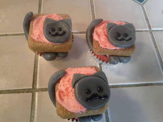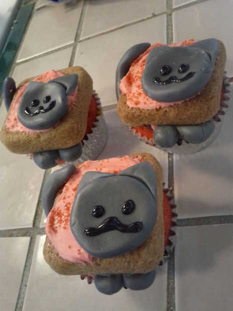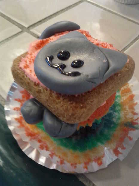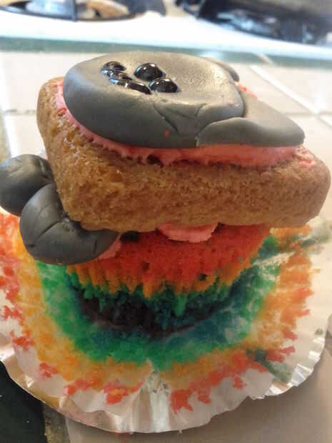 Son cupcakes blancos con una galleta, helar, sprinkles y fondant en la parte superior.