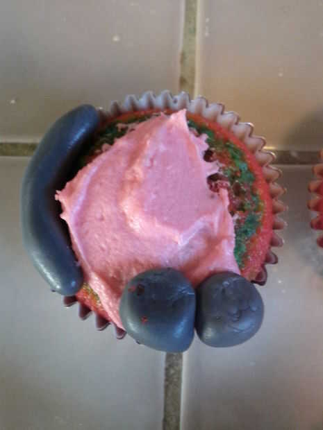 Posición de las patas y la cola en el Magdalena. Coloque dos de las más pequeñas bolas redondas al lado del otro y en la parte inferior de la Magdalena. Se puede sumergir parte de ellos en el glaseado para ayudarles a permanecer en el Magdalena. Tomar el tubo largo de pastillaje (fondant) y colocarlo en el lado izquierdo de la Magdalena y ligeramente curvada. (Véase el cuadro 4)
