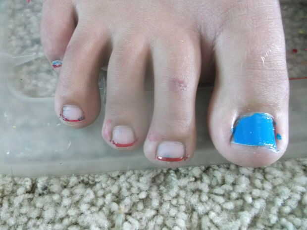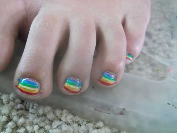 Limpiar el pulimento apagado el cepillo del arte del clavo negro y sumergir en rojo. Pintura de arco iris rayas, eliminar el color viejo antes de sumergir la pintura siguiente. Si está pintando este diseño en otra persona, lo contrario de como hacer estos, o tendrás que hacer lo que hizo-pintura del Nyan Cat boca abajo. Es difícil, evitar si es posible!