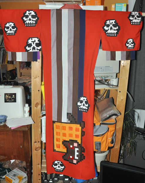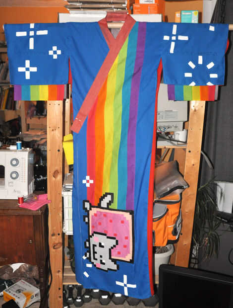 Este es mi gatito Artemis este traje de Nyan Cat (un meme de internet para ésos desconocedores)! La idea vino de solo querer tenerla a parecerse a un gato famoso de internet, y así sucedió es gris como el Nyan Cat. Usé una caja de cartón ($0.00) que
