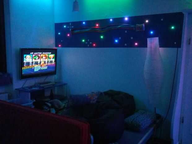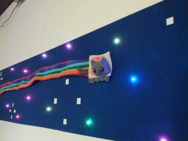 Para crear una zona de juegos para niños adultos, teníamos que hacer algo acerca de las aburridas paredes blancas que la rodean. Así que decidimos utilizar el conocido meme Nyan cat de internet como decoración.