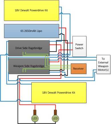 El siguiente paso fue hacer la transición el sistema eléctrico del viejo Nyx Nyx nuevo. Ya que cualquiera que intente replicar el proyecto no tiene un sistema eléctrico ya terminado, he proporcionado un diagrama que muestra cómo el bot está conectado por lo que tendrás algún material de referencia. Para los motores impulsores usé conectores de bala de 4mm para conectar a su Ragebridge. La Ragebridges y potencia luces estén conectadas al botón de encendido y a tierra mediante conectores Deans. La batería sí mismo también utiliza conectores Deans. Los motores de la arma fueron revisados y atado con alambre, que también podrá conectar a su Ragebridge mediante conectores Deans. La polarización de conectores deans significa que una vez que tienes derecho no tiene que preocuparse de conectar las cosas al revés en el futuro. En cuanto a conectores macho/hembra se refiere, que mi enfoque estándar es que cualquier conector eléctricamente más cerca de la batería sea el lado femenino. Esto reduce considerablemente las posibilidades de cortocircuito del sistema eléctrico.