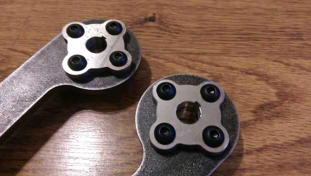Esfuerzo de torsión se transmite a la palanca por medio de 2" de ranura que es proporcionada por colocando los brazos acero con varias 7075 placas de 1/4" adaptador. Los brazos y las placas fueron cortadas en un chorro de agua con la ranura en el perfil. Debido a la naturaleza del chorro de agua corte los recortes era necesario tener las ranuras acabado para proporcionar las esquinas adecuadas. Esto se hace con una prensa de árbol de dos tonelada y una brocha. Emperna cada mitad juntos antes de brochado aseguró que el perfil de la ranura final alinearse a través de todo el conjunto.