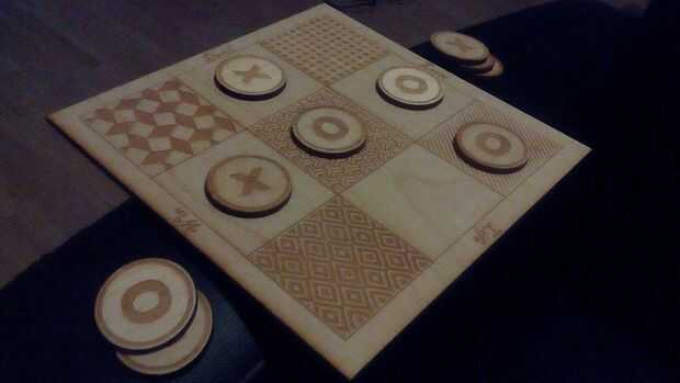 Este es un clásico juego de X y O. Este proyecto pretende hacerse utilizando un cortador láser. Es un proceso sencillo y divertido hacerlo. Tardamos más o menos de una hora para crear el diseño y alrededor de 30 minutos para cortar con un cortador láser. Usted puede encontrar los pasos y las descripciones en las imágenes. Utilizar Inkscape para el diseño.