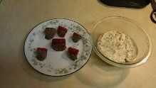 Después de que ha terminado su tiempo de congelación tomar fresas, relleno y cerezas al marrasquino. Usé un cuchillo de mantequilla para rellenar en la parte superior de las fresas.