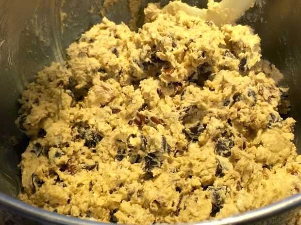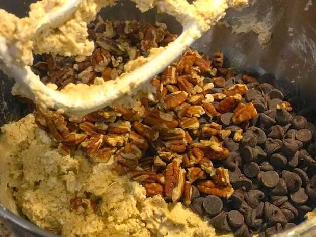 Revolviendo suavemente en a mano, añadir trocitos de chocolate y tostado de frutos secos. Raspar el tazón de fuente.