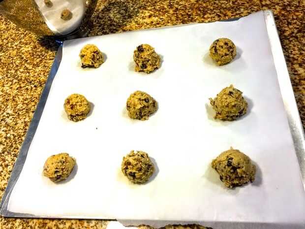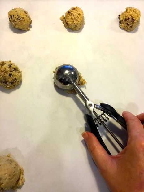 Con una cucharada de la parte, o cuchara asegura tamaño constante y el rendimiento apropiado de cookie. Sacar la masa sobre las hojas para hornear preparadas y nivele la masa en el borde de la taza para las galletas perfectamente redondas. Espacio de 2" entre galletas.