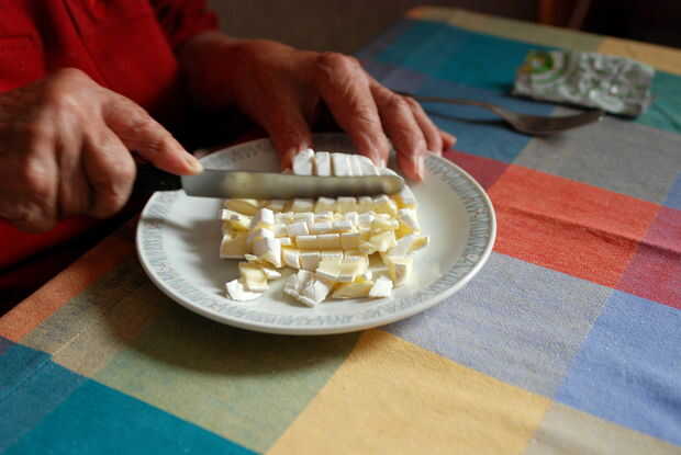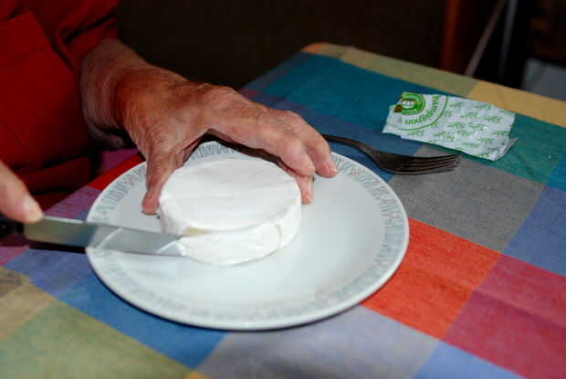Coloque su Camembert en un plato y encontrar un modelo bonito de mano que corta el Camembert en dados pequeños. No hay necesidad de ser especialmente precisa, será ser puré de todos modos pronto...