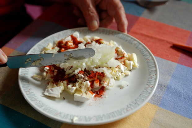 Añadir 1,5 cucharadas de pimentón dulce en polvo, media cucharadita de comino y una cucharada de cebolla dados super fino. Mezclar todo junto.