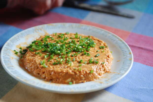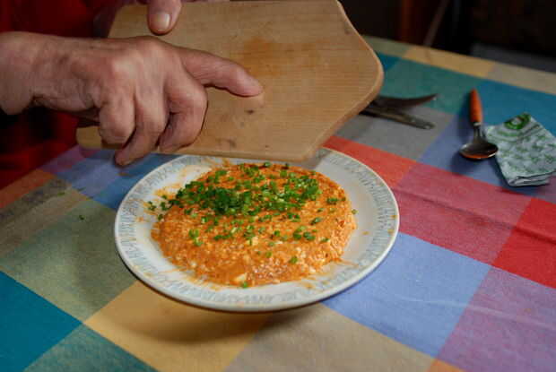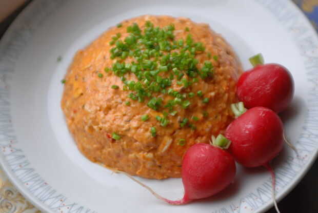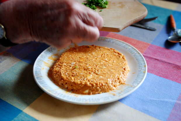 Tradicionalmente el Obatzda es servido en un plato y la forma de una cúpula, pero mi abuela prefiere a forma como un disco. Use un cuchillo para el queso extendido según sus preferencias de estilo de la forma. Utilizamos el mismo plato para mezclar y servir, puede utilizar una toalla de papel para limpiar el borde de la placa. Y por supuesto también podría servir el Obatzda en un recipiente.