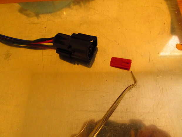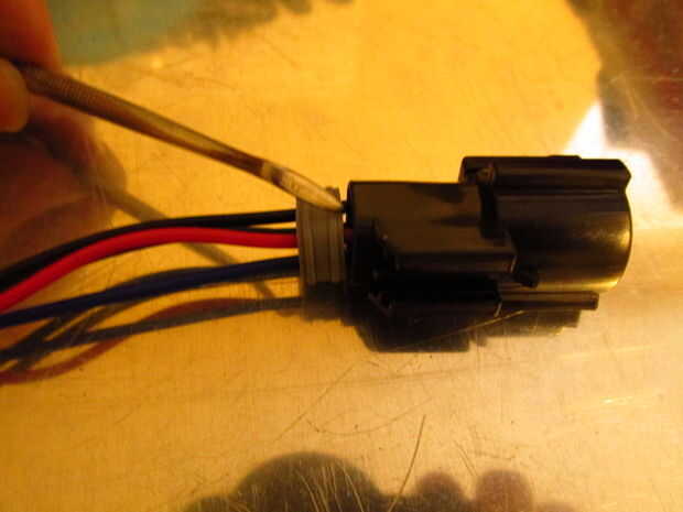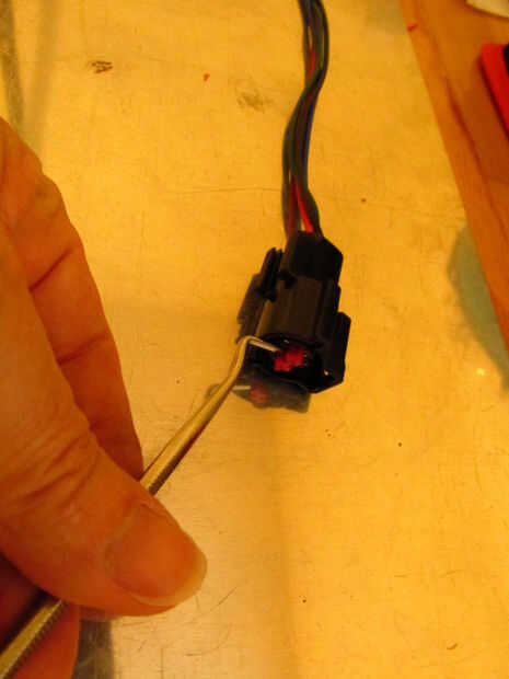 Esta parte es un poco más difícil. Mirar dentro del conector de los contactos eléctricos. Sobre 3/8ths de una pulgada abajo usted verá una pestaña pequeña; Utilice la herramienta suavemente Levante esa pestaña y deslizar el conector eléctrico de la caja.