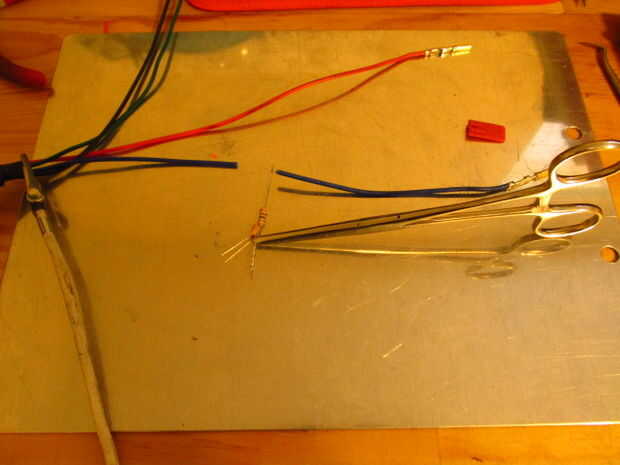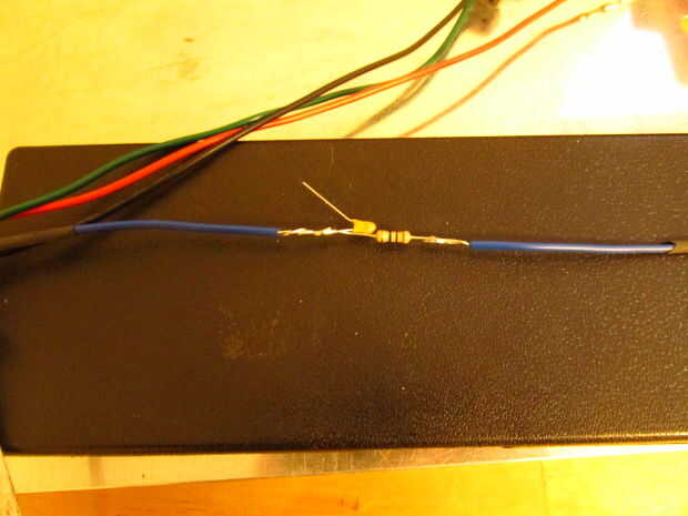 El cable corto desde el condensador al cable en un extremo de una resistencia de la soldadura. Usé un par de pinzas hemostáticas para proteger el condensador de daño por calor (soldadura lenta).