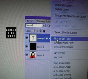 En la paleta capas, haga clic derecho en la capa de texto. Seleccione "tipo rasterizar" en el menú.