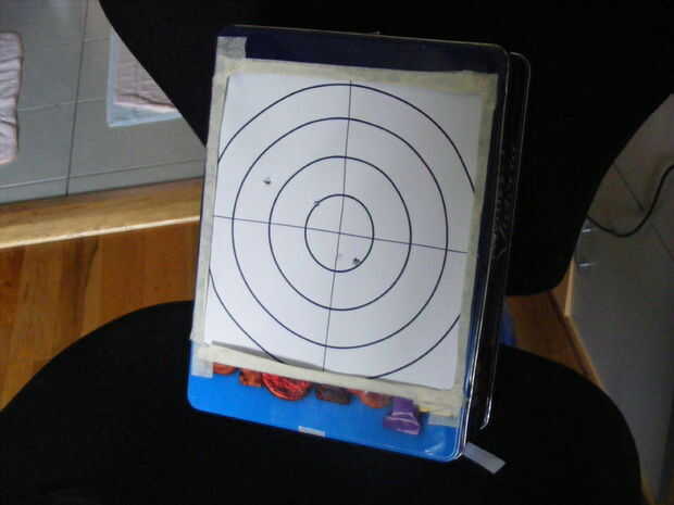 después de semanas buscando en la web, tuve que hacer mi propia solución a lo que es más probable un problema infrecuente.Problema: Cómo hacer una Diana con dardos de pie que puede ser utilizado como un blanco de pistola de airsoft.Otro problema: her
