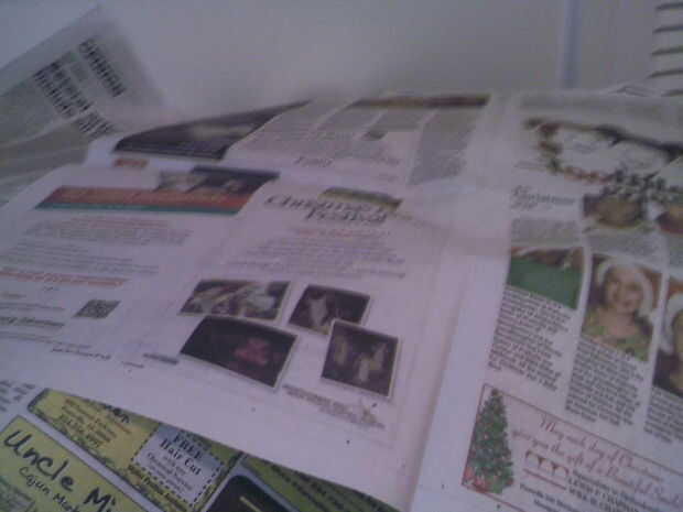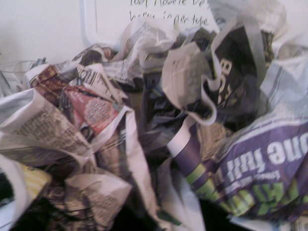 Colocar cerca de una a dos hojas de periódico dependiendo del tamaño de la caja.  Coloque las piezas en bolas.