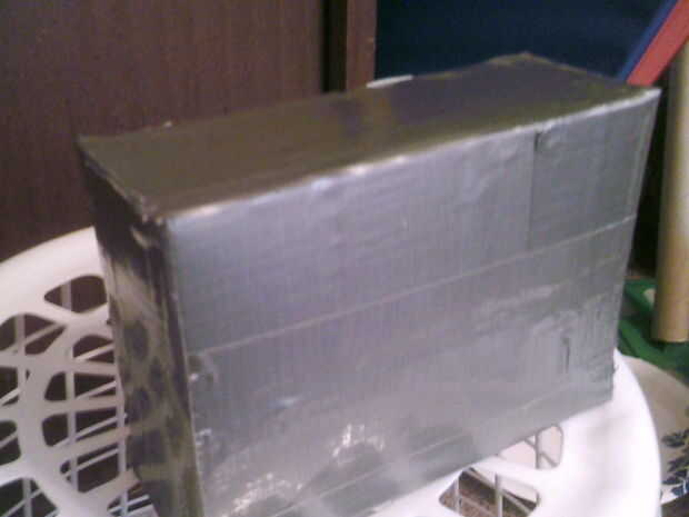 tengo algunos dardos en mi arsenal de cerbatana que paraliza o lesionar el destino. La saliva de la munición debilitará la integridad de la caja mucho, lo que permite que el "aturdimiento" dardos a penatrate la caja. Para conteract este problema, envuelve la caja en cinta aislante. Apliqué una capa, dos a tres capas en la parte frontal y una capa en la parte posterior en los lados, superior e inferior, así.