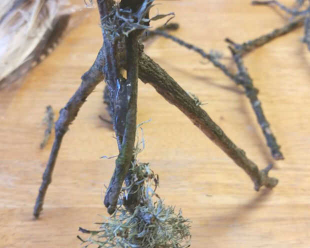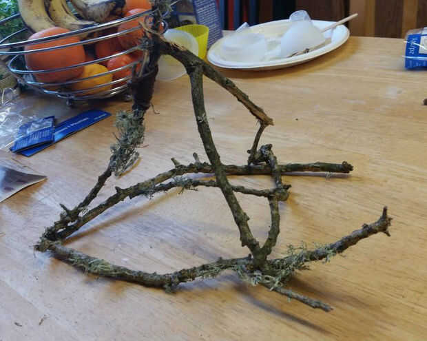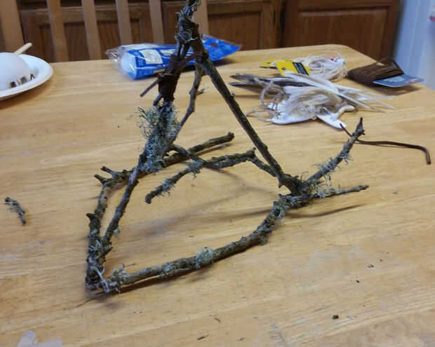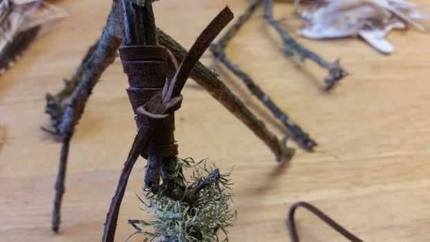 Yo jugaba con los palos por un tiempo llegar a una forma que me ha gustado. Yo sabía que quería hacer un vagamente la forma de triángulo con las ramitas que encontré, así que tocó el violín con ellos hasta que encontré una configuración que me ha gustado, entonces pegado con pegamento caliente en los puntos de contacto. Para ocultar el pegamento caliente, utilicé la cuerda de cuero para envolver alrededor de las áreas se unieron y había asegurado con nudos dobles.