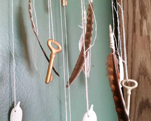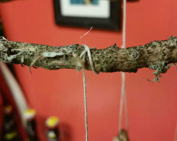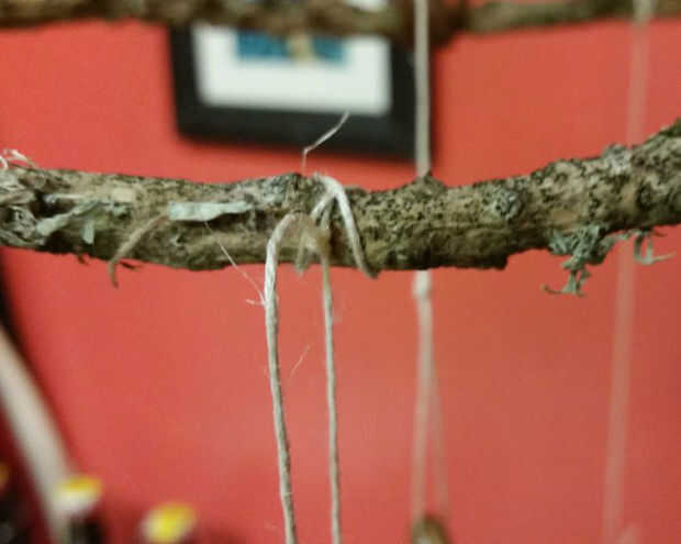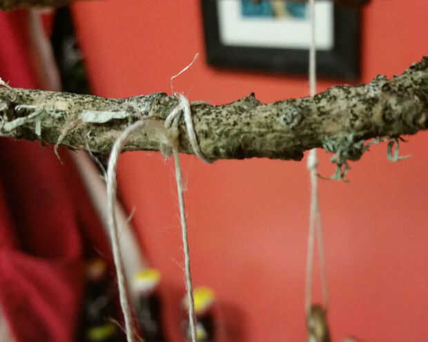 Para sujetar las plumas y encantos, utilicé la cuerda delgada de cáñamo. Me envuelve las plumas bien y asegura el nudo con un poco de pegamento caliente. Luego envuelve el otro extremo varias veces alrededor de la parte de la estructura de la rama construido, un nudo y asegurar con un pequeño toque de pegamento caliente.