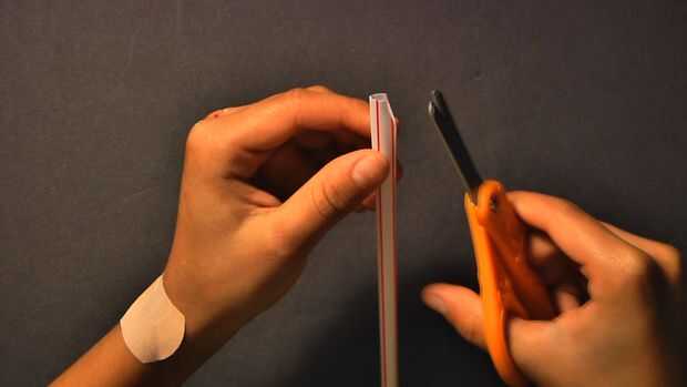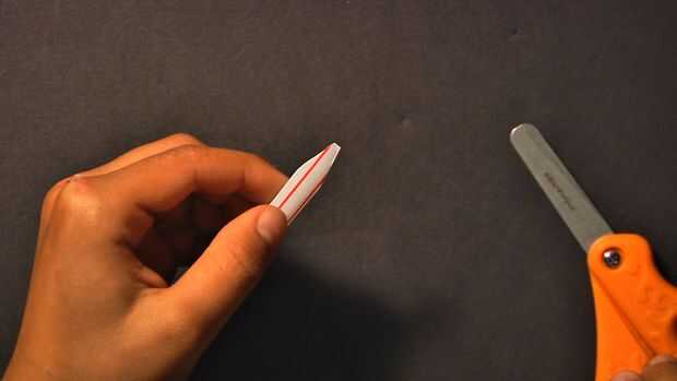 Aplane un extremo de la pajilla con los dedos o dientes. Cortar una esquina de la parte aplanada de la paja a partir de 1/2 pulgada hacia abajo de la paja y el final un poco fuera del centro. Repita con la otra esquina de la parte aplanada de la paja. Su punta de paja debe tener dos aletas que parecen trapezoides (triángulos con una tapa plana). Se puede jugar en este momento, pero me gustaría añadir un amplificador.