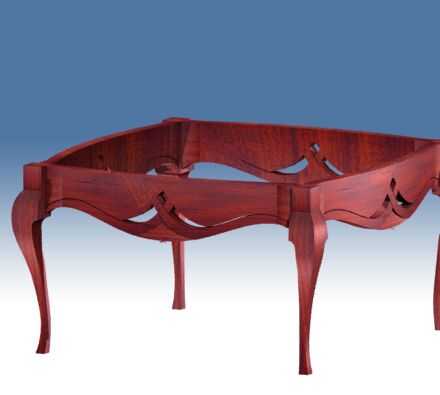 el marco es la parte difícil. Las piernas son como cabriolen las piernas y se hacen a mano (sólo al cortar con la Sierra de cinta gezaagt). las reglas están dobladas a través de un molde en una prensa de vacío. luego se encamina en la máquina CNC 3d. las piernas y las reglas están conectadas entre sí a través de una conexión de agujero (que es también hecho a mano) y perno clásico.
