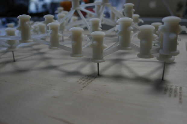 Que forma la parte inferior de las bocas con las clavijas y aseguramos las clavijas alineación a la plantilla de taladro. Hice ajustes en las alturas de los pasadores para asegurarse de que el ajuste era perfecto.
