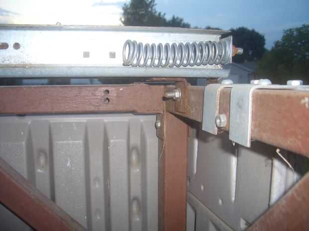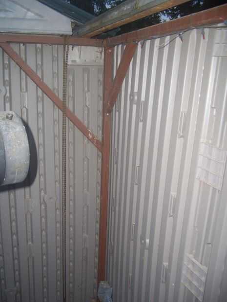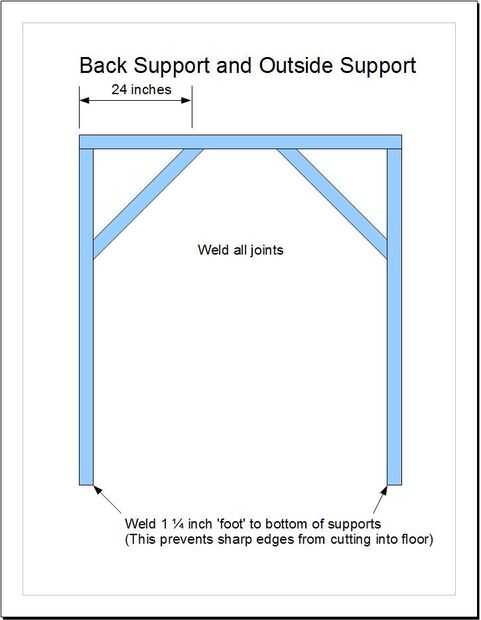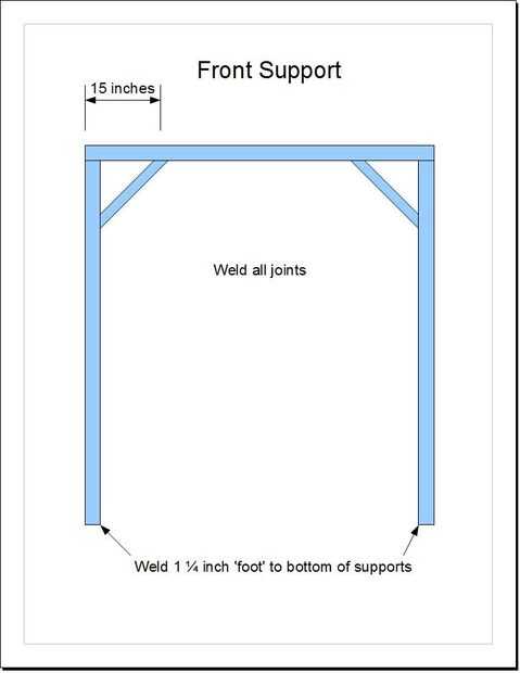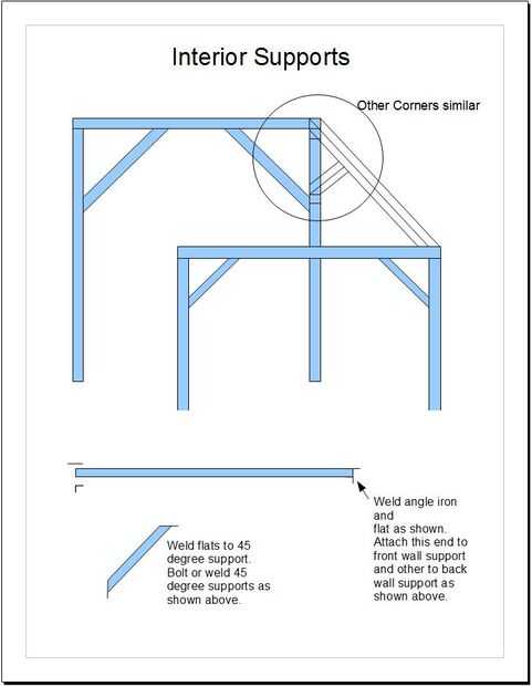 Dos soportes conectan el soporte frontal al nuevo soporte. Mida la longitud para caber su cobertizo. Soldar un corto recto de la barra a la parte superior y un soporte en ángulo a la parte inferior de ambos extremos para que las vigas de soporte interior pueden sujetarse al frente y detrás apoya con pernos. Esto permite que la estructura a desmontar para el transporte. Yo también de compatibilidad con el modo dos armas para cada una de las vigas interiores. Ver la figura de apoyo Interior.