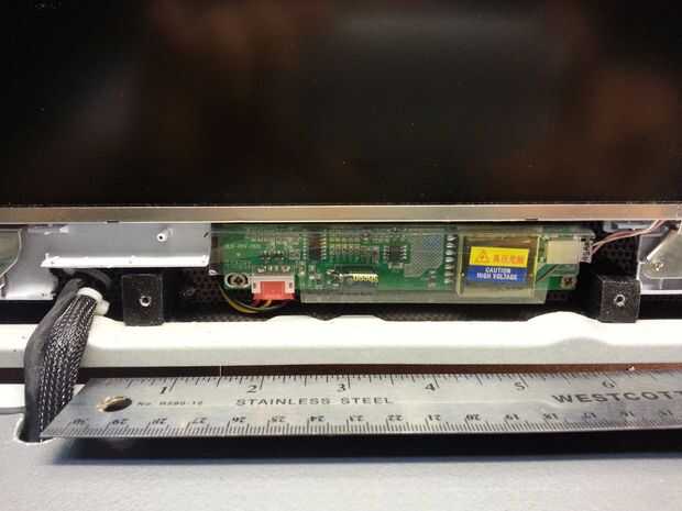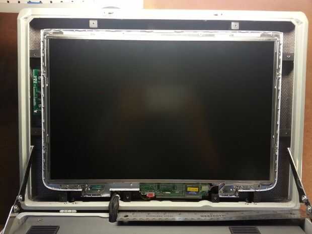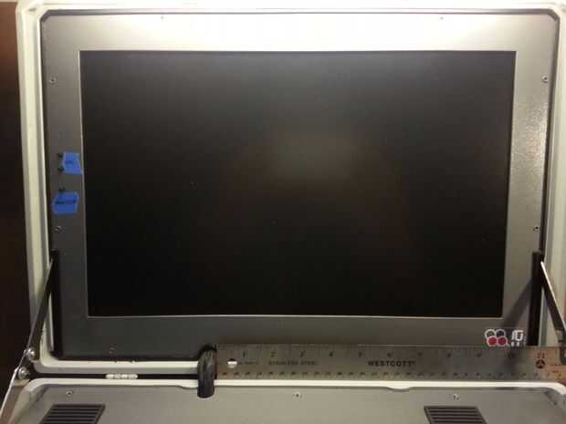 La mitad superior de la cartera tiene al monitor. El bisel de la pantalla es poliestireno de hoja de 1/16". La pantalla de cristal líquido de 17 pulgadas (LCD) fue rescatada de un ordenador portátil de HP. Carcasa externa de la computadora fue utilizada para montar la pantalla a la mitad superior de la cartera. Infraestructura adicional de montaje consta de 1/2" de espuma PVC para enganchar en el borde de la cartera. Dos pequeñas placas de circuito fueron fijados a la carcasa del portátil. Un tablero, situado a la izquierda, controla las funciones del LCD. La Junta, ubicada en la parte inferior, unidades de la pantalla LCD luz de fondo.