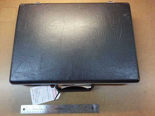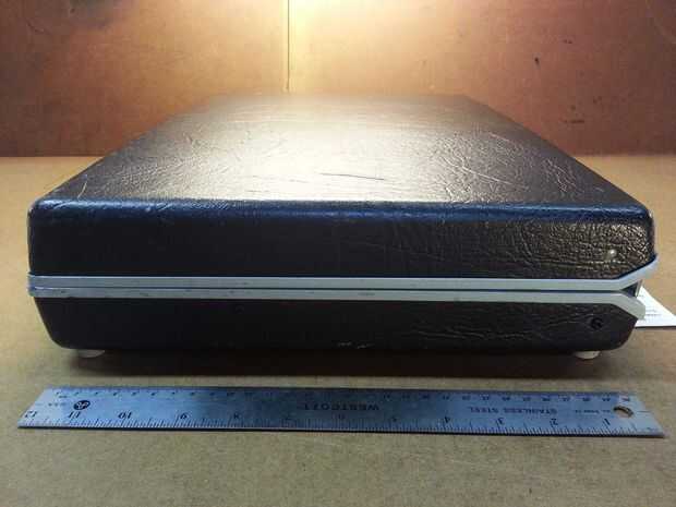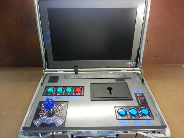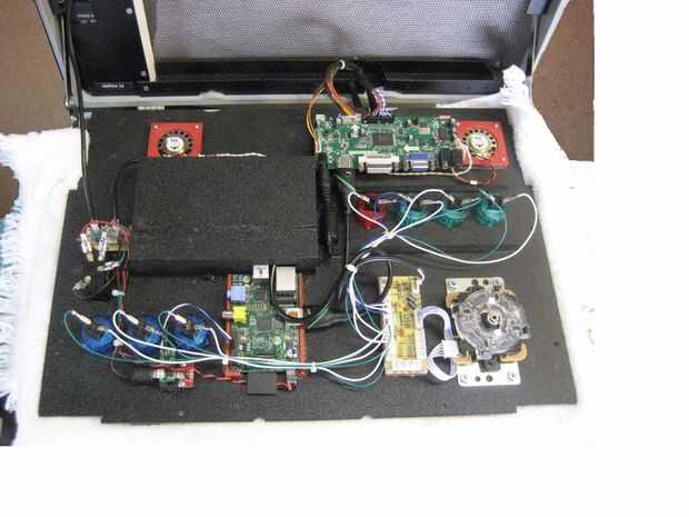 Descripción general: El maletín contiene a un monitor que se encuentra en la mitad superior. La parte inferior la mitad tiene un compartimiento de almacenamiento que tiene un cable de alimentación y un joystick desmontable. La parte inferior la mitad también tiene el mecanismo de la palanca de mando y ocho interruptores de botón. Hay 3 azules, 3 verdes y 1 rojo botones. Hay un interruptor de tipo balancín iluminado en el borde derecho.