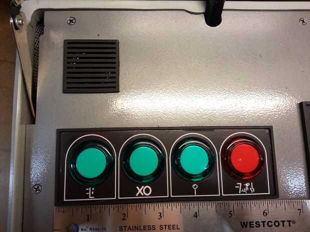 Aproximadamente traducido y extrapolados a partir de uso del dispositivo, de izquierda a derecha las etiquetas son los siguientes: "Crédito", "Jugador", "Pausa", "Escape", "Shoot", "Jump", "desconocido". Fines de "testing", los botones fueron etiquetados en inglés con cinta de enmascarar azul.