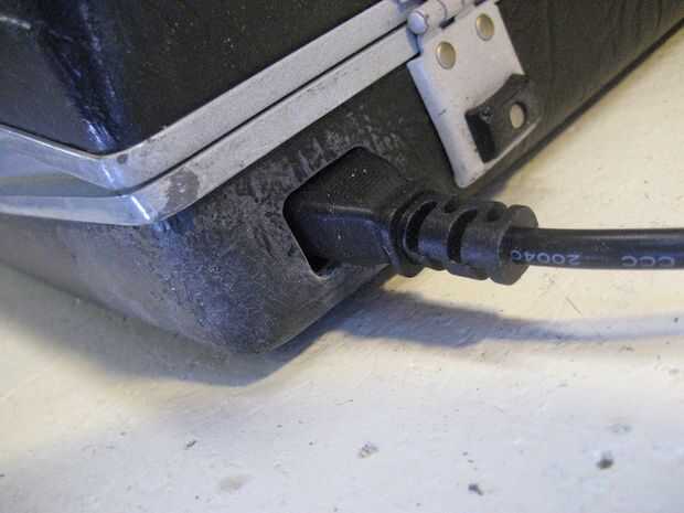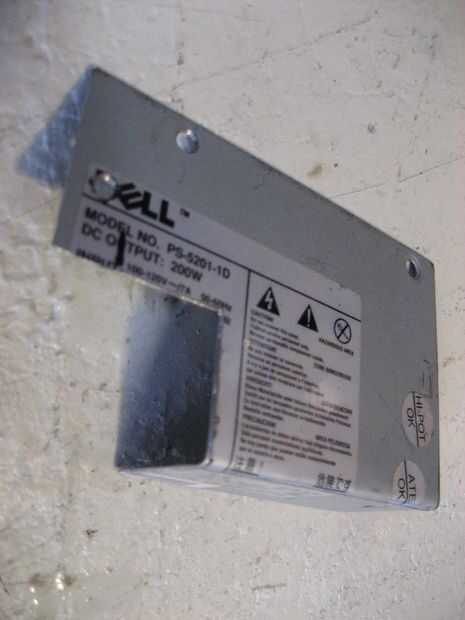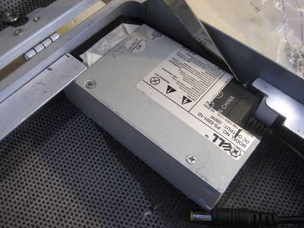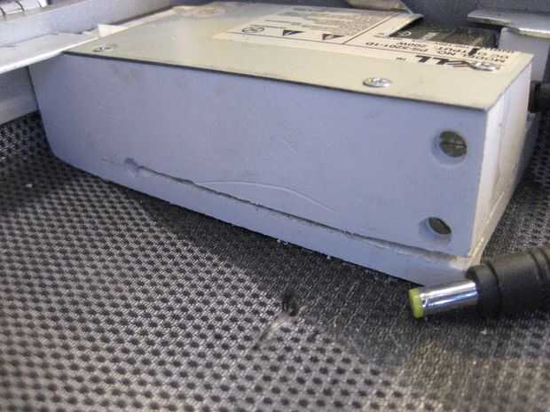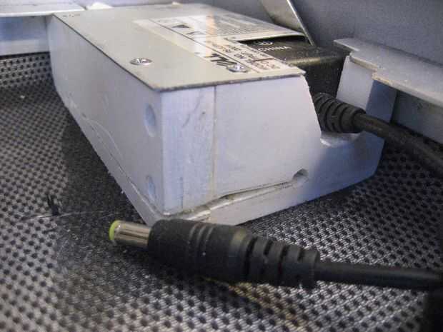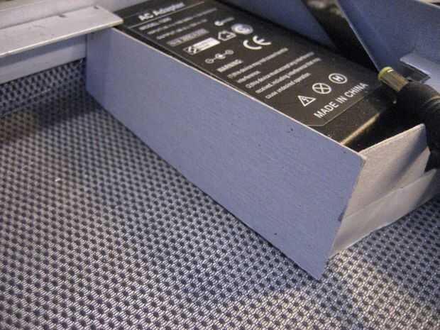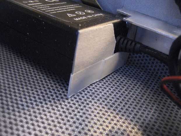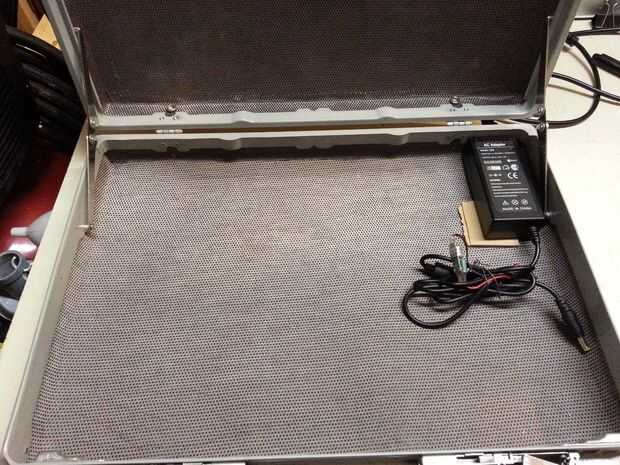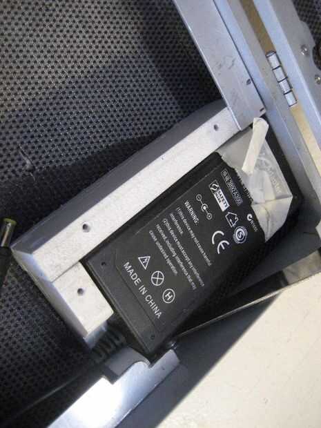 A continuación fue montaje de la fuente de alimentación. Quería fácilmente quitar la fuente de alimentación para que lo bloquearon en el lugar con algunos 1/2" de espuma hoja del PVC (Sintra). Colocado la fuente de alimentación donde quería y utiliza cartón para burlarse de algunas plantillas. Las plantillas fueron transferidas al PVC espumado. El PVC espumado fue corte y ajustaron en el maletín. No quería que la fuente de alimentación para moverse por lo que fabricado un soporte de sujeción usando chatarra (cubierta de la zambullida disco duro) que doblado a 90 grados, que el soporte fue atornillado en el PVC espumado. Por último, corté un agujero en la esquina trasera del maletín que alineada con la entrada de conector de alimentación.