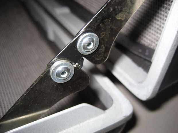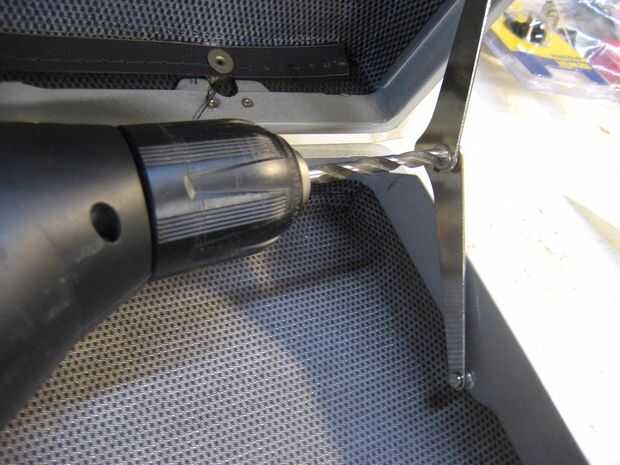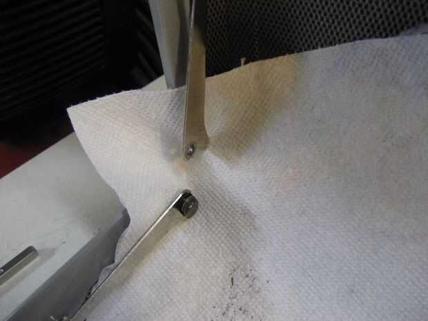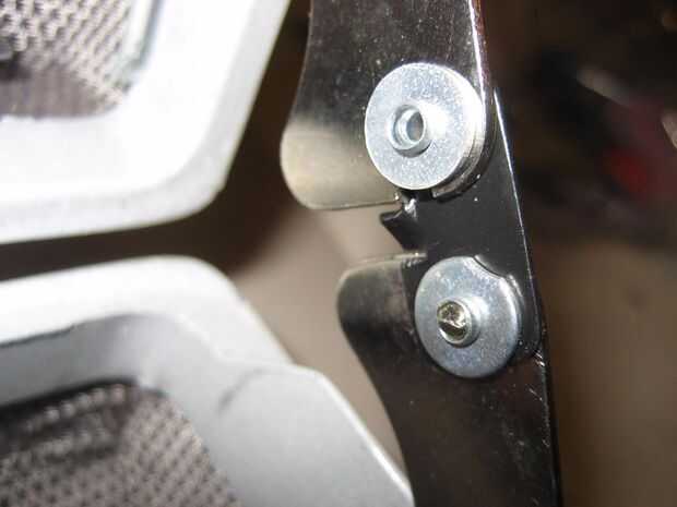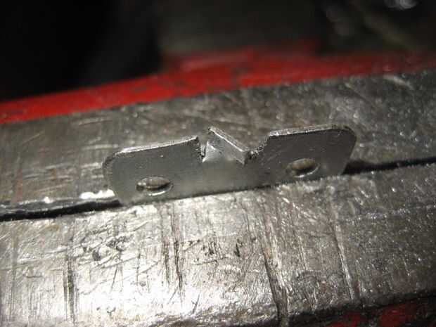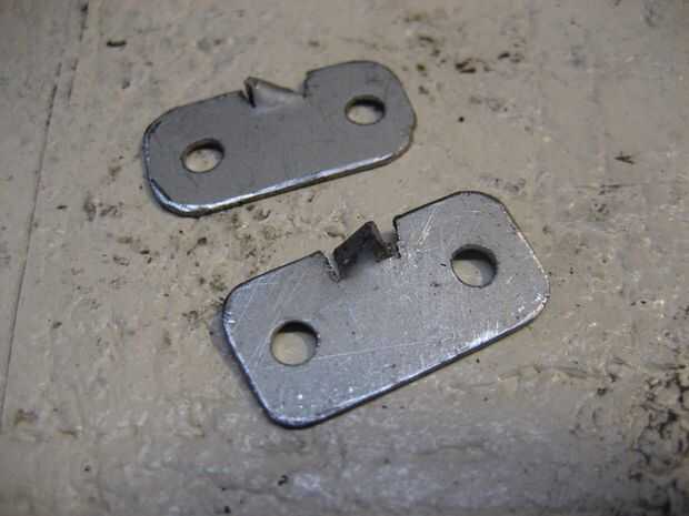 El enlace de extensión se fabrica de chapa calibre 12. Las medidas de link 1 "x 1/2" 1/6" orificios fueron perforan 3/8" aparte. Dos ranuras fueron cortadas con una sierra para metales y retorcidas para formar una rotación "parada" que es necesario para que las bisagras no pueden girar en la dirección equivocada. Para instalar los enlaces sólo perforación la existente bisagra remaches y remache pop en los nuevos enlaces.