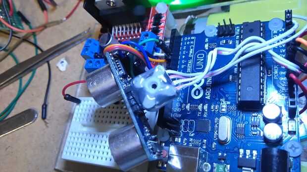 Use un pegamento para unir el motor servo pequeño en la parte frontal de nuestro robot. Ver la primera imagen arriba para entender como poner el sensor de ultrasonidos en el motor servo utilizando una pieza del engranaje pequeño.
