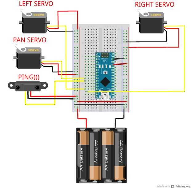Como se puede ver, el circuito es muy sencillo otra vez. Nada ha cambiado desde el primer robot parte de añadir un tercer barrido servo al pin D6 de Arduino. He intentado hacer el esquema tan limpio como sea posible y creo que es bastante fácil de seguir. Si el robot no está funcionando correctamente, el único problema/s que preveo están en algún lugar dentro del código. No dude en pedir ayuda. Como se señala en mi obstáculo anterior evitando robot instructable,