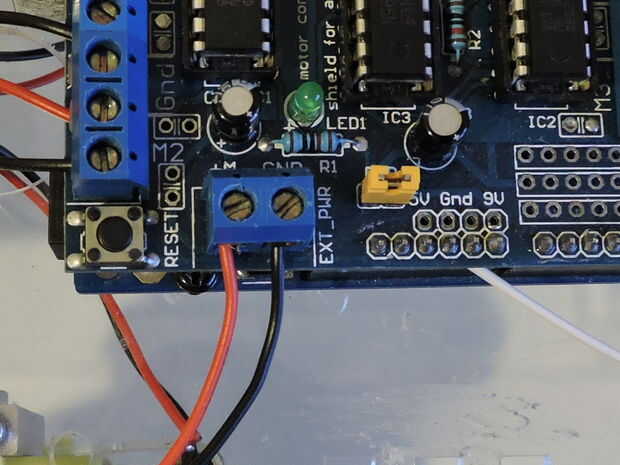 Cada escudo del Motor tiene (al menos) dos canales, uno para los motores y otro para una fuente de energía. Busque los canales y conectar motores de su chasis en canal de los motores, y cualquier potencia de la fuente le están utilizando (por ejemplo baterías del AA, batería de litio) al canal de la fuente de alimentación.