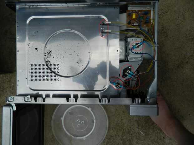Hay dos conectores de presión en la parte inferior del magnetrón. Simplemente desconecte estas. El magnetrón puede eliminarse mediante la eliminación de cuatro o cinco tornillos. Como esto es un magnetrón perdido, estos tornillos pueden ser desechados.