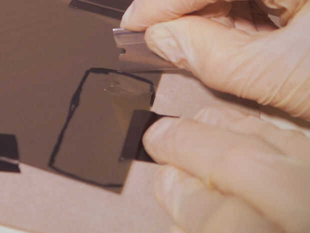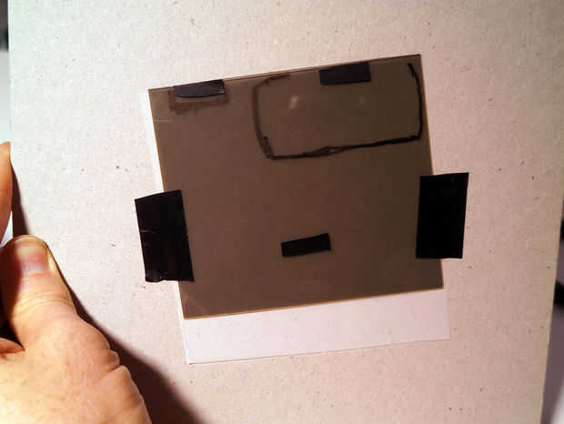 Para seguir, me corte un rectángulo pequeño de cinta aislante y colocar en cada uno del borde inferior de cada pieza. También, marcar la pieza principal de la polarización de película de plástico para que puedas volver atrás y cortar más tarde.