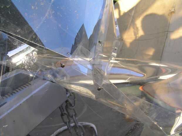 Perdón por la imagen confusa. No tomo fotos al construir el cono del silencio, y consiguió un poco dañado después de que usé en el campamento de iglesia para que hice originalmente. Pero lo que ves aquí son el domo conectado a la broca plana y la falda. Puede ver donde la pestaña en la parte inferior de cada segmento de la domo se une a la falda por simple superposición y split join pin. Tendrá al menos 2 o 3 clavijas por el segmento de la domo para sujetarlo firmemente.