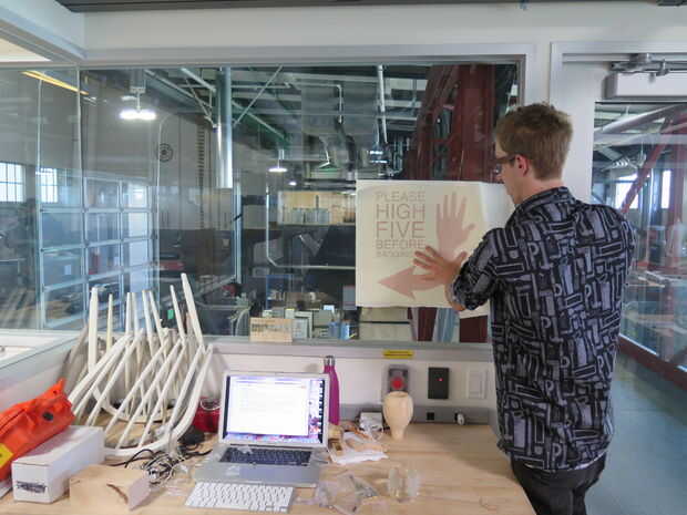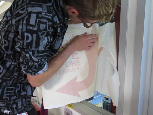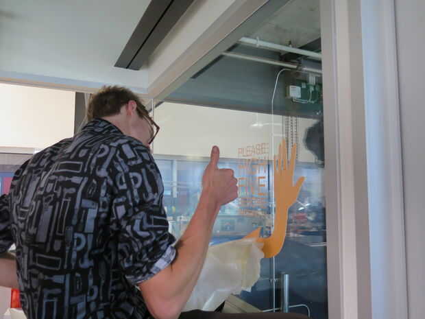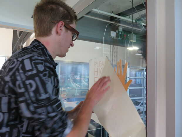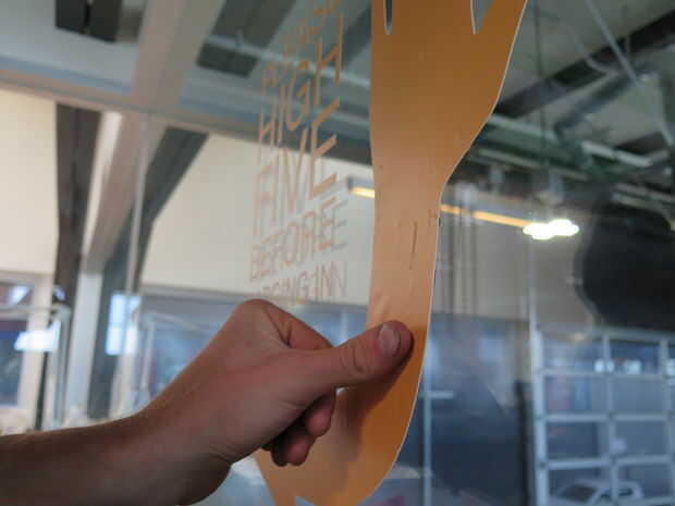 Lentamente retire la etiqueta engomada de la copia de seguridad y presione el papel de transferencia y los gráficos en la ventana. Con una escobilla de goma o herramienta similar podría ayudar a conseguir mejor adherencia a la ventana. Apenas apreté extra duro con mi pulgar.
