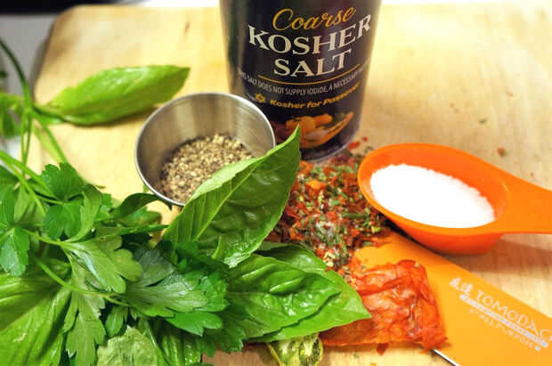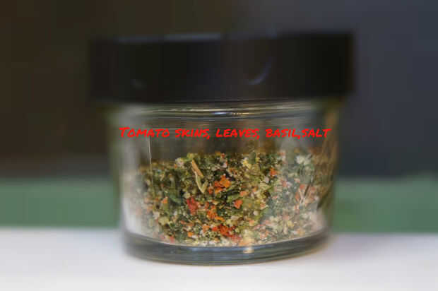 He compuesto por varios tipos de sales sazonadas con pieles de tomate secos, frescos y secos de hojas de tomate verde, romero fresco, pimienta, sal kosher y albahaca fresca. Me encanta la idea de preservarlos de esta manera.
