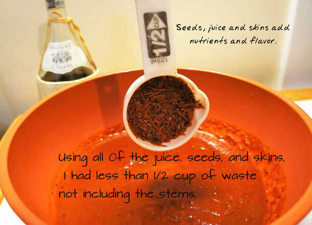 En el inicio de este proceso; He quitado el jugo, semillas y pieles y se sorprendió de que eran casi como muchos de ellos como la parte carnosa del tomate. Hizo una gran diferencia con todo excepto los tallos. Sé que muchos cocineros probablemente simplemente conservar salsa de tomate y salsa para espagueti de ellos pero una salsa muy buena es muy laborioso ya que tiene que ser vigilada muy de cerca y tarda mucho para hacer, en comparación con salsas simples. Me gusta la idea de hacer esta salsa con antelación para ocasiones especiales y puedo gastar mi tiempo preparándose para el evento y no tienes que hacer todo en una carrera. El sabor es excepcional porque usé casa cultivadas tomates y algunas hierbas frescas.