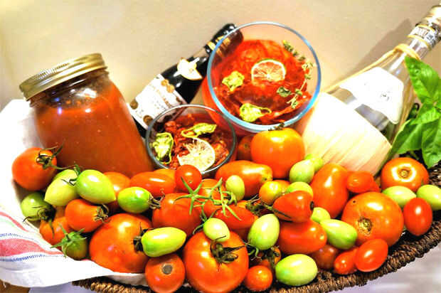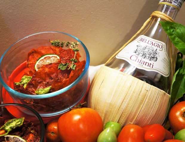 Variedad de tomate seco ajo orégano y tomillo, de romero fresco y albahaca fresca , Sal Kosher, vinagre, bicarbonato de sodio, azúcar, vino tinto y pimienta fresca molida.
