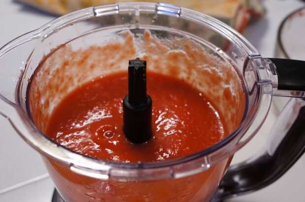 Añadir tomate y pieles para el procesador de alimentos y pulse hasta que quede una salsa espesa. "o una batidora o trituradora.