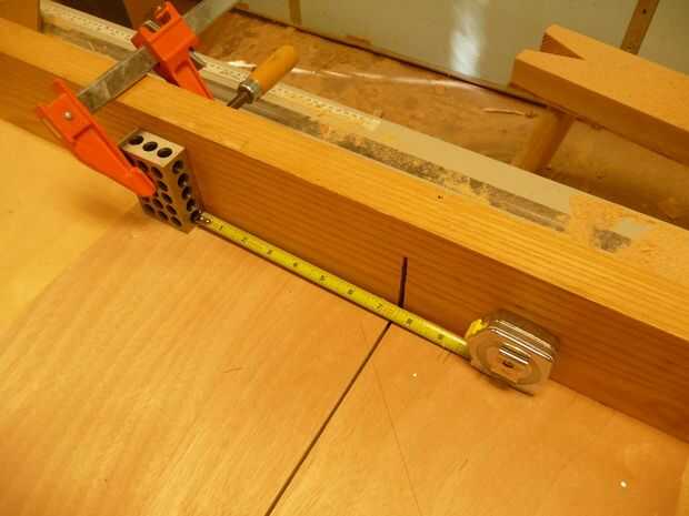 En este ejemplo quiero trozar una pieza 7-3/8' largo. Usar una cinta métrica para colocar el bloque en la posición deseada. Siendo la escuadra corta la misma longitud sin tener en cuenta el espesor de la madera.