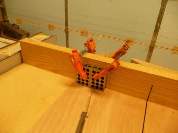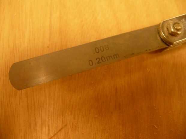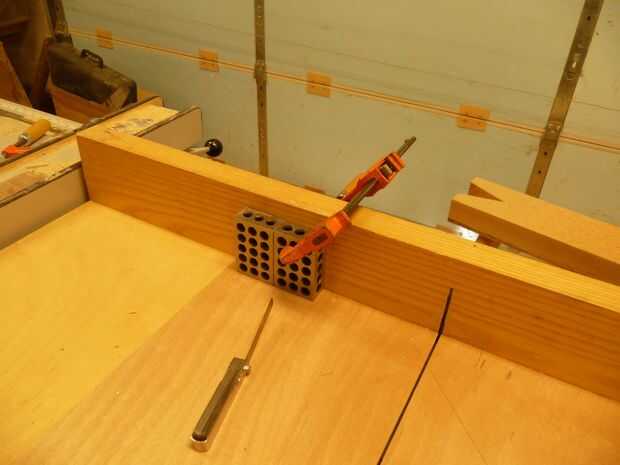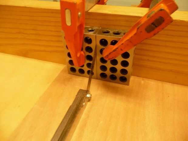 Después de tomar una prueba de corte, me pareció que la pieza 8 milésimas demasiado largo. La parada tiene que mover 0,008". Para hacer esto se necesita una galga. Coloque la galga de tamaño correcta en la cara de la parada y sujete el bloque de repuesto a su lado (uno con la pinza torcida). Soltar el bloque de tope, quitar la galga y mover el bloque de parada junto al bloque de repuesto. Abrazadera del bloque de la parada de colocar y quitar el bloque de repuesto. La parada se ha movido ahora en 8 milésimas.