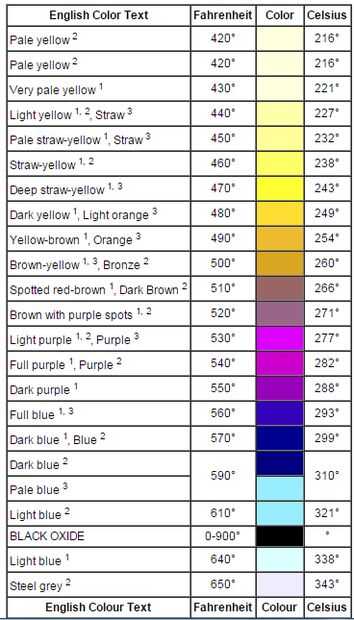 La tabla que se aprecia en las fotos no es muy precisa, porque casi cada acero tiene una diferente mezcla de metales. Así que cada acero cambia colores en su propia temperatura.