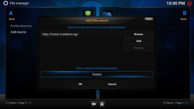 En el Kodi pantalla principal vaya a administrador de sistema/archivos y seleccione Agregar fuente. Seleccione la casilla superior que dice "< none >" y el tipo de http://fusion.tvaddons.ag a continuación, pulse hecho. En el cuadro de texto inferior entre fusión y presione ok. Volver a la pantalla de inicio y luego ir a ajustes del sistema y seleccionadas add-ons de la izquierda. Presione OK en la ventana emergente. Seleccione "instalar desde zip" y luego la fusión "empiece aquí" luego plugin.video.hubwizard en la parte inferior de la lista.