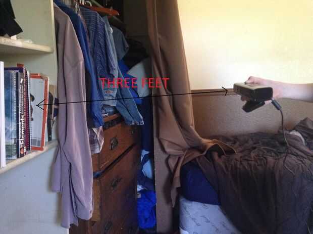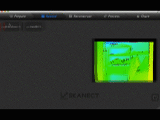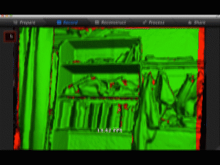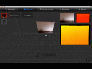 Ahora, tienes que girar lentamente el Kinect alrededor. Trate de concentrarse en un objeto al principio. Puedes ver el GIF de arriba para ver cómo hacer esta [foto 1]. Con mucho cuidado, deberás agacharte un poco para obtener el fondo de los objetos (en este caso la estantería), obtener los lados de un objeto, etc.. Una característica extraña con el Kinect, es que no graba las sombras. Esto incluye objetos del oscuro/negro, como se puede ver en el GIF de arriba [foto 1]. La parte superior de una maleta era negra, por lo que habrá un agujero en el más adelante. Pero ahora, que realmente no debería ser un problema. Otra característica impresionante impresionante, es que pueden explorar las zonas oscuras que incluso una cámara no podía captar. Por ejemplo, he podido analizar el interior de un armario, a pesar de que allí estaba un poco oscuro.