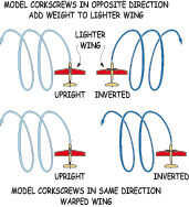 Obviamente el equilibrio lateral de modelos con motores lateral va a estar fuera desde el principio, por lo que se puede esperar de este lado a ser pesado. Equilibrio lateral puede ser corregida mediante la adición de pequeñas pesas al ala más ligera, como cerca de la punta como sea posible, hasta que el modelo las pistas rectas tanto vertical e invertida. En las alas del planeador moldeado el peso se puede Agregar para el servo del alerón externo bahía o bajo un sello de vacío cerca de la punta. Si tienes suerte suficiente tener un ala combado y decidir quedarte con él, usted podría considerar reducir el efecto mediante la adición de una lengüeta del ajuste en la parte inferior de material del borde de fuga, o experimentando con la mezcla en su Tx. mente te, esto es realmente un compromiso y probablemente nunca lo tendrás perfecto.